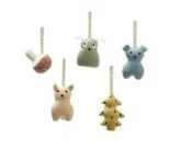 Fir tree: 12x9x4 cm. Mushroom: 10x7x7 cm. Max the bear: 12x8x4 cm. Sus the owl: 10x8x4. Vera the fox: 12x8x4 cm. String: 20 cm.