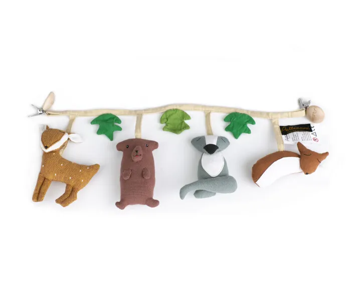 Ett snyggt, Fair Trade-märkt och ekologiskt barnvagns-hänge med skogens djur som tema och två klämmor - en i varje sida - att sätta fast den med. Hänget har ett rådjur, en björn, en grävling och en räv samt tre löv som svajar med vagnens rörelser eller vinden och ger den lilla något kul att titta på eller undersöka under promenader med vagnen. När barnet har blivit äldre (3 år) kan de stoppade figurerna klippas loss från bomulls bandet och lekas med som små trasdockor. Tillverkad i en Fair Trade certifierad fabrik av ekologisk bomull samt klämmor av metall och trä samt kommer i en påse av organza. Alla material och färger är ekologiska samt ofarliga för både miljön och de som jobbar med dem. Inga djurförsök av något slag har använts i utvecklandet eller producerandet av denna produkt eller dess beståndsdelar. Kan tvättas vid behov.