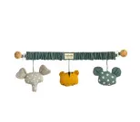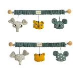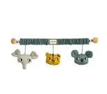 Ett snyggt och kul ekologiskt barnvagnshänge i form av ett elastiskt band med tre lätt stoppade figurer hängande under: ett elefanthuvud, ett tigerhuvud och ett koala huvud. Figurerna har tryckta mönster på baksidorna och svänger eller viftar när de påverkas av vinden eller vagnens rörelser och ger det lilla barnet får något kul att distrahera sig med under långa promenader. En vacker dekoration i sjögrönt, ljusgrått och ockra gult, där djuren har tryckta samt broderade detaljer och där det elastiska, rynkade bandet har en klämma i varje sida som är dekorerad med en ovansida av trä. Barnvagnshänget är Oeko-tex certifierat och sytt i 100% ekologiskt bomullstyg samt stoppat med polyester fiber. Torkas av med en fuktig trasa och hängtorkas vid behov.