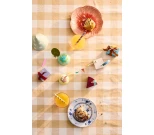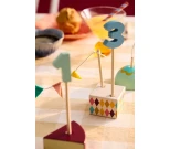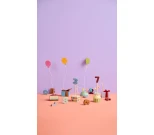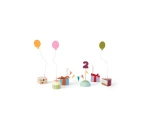 Denna bordsdekoration i trä för födelsedagar innehåller figurer som föreställer tårtor, cupcakes och små presenter. Varje figur har ett nummer för att markera födelsedagsbarnets ålder. Setet kommer med siffrorna 0 till 9 samt en extra siffra 1, vilket gör att det kan användas vid flera födelsedagar. Två ballonger i filt på metalltrådar ger en extra dekorativ detalj. En papplåda ingår också, där alla delarna kan förvaras och tas fram år efter år. Designat för mångsidig användning erbjuder detta set ett roligt sätt att fira födelsedagar på ett enkelt och anpassningsbart sätt.