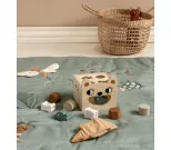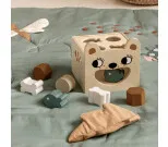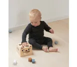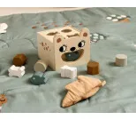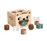 En snygg sorteringsbox av björkträ, dekorerad som en björn och med fyra olika former på klossarna: runda, sexkantiga, fisk och ben. De klossar som barnet har lyckats passa in i rätt hål kan tas ut antingen genom nallens glada mun eller genom att lyfta på locket. Lådan kommer med åtta klossar, två av varje form. Torkas av med fuktig trasa vid behov.
