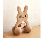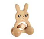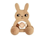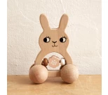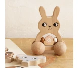 En rolig träleksak i form av en kanin med inbyggd skallra som kan rullas omkring på sina fyra hjul. Själva skallran består av tre stora träpärlor, varav en är formad som en blomma, och som slår ihop med varandra när leksaken skumpar över någonting eller byter håll plötsligt. En rolig aktivitetsleksak som kan inspirera småbarn till att börja röra sig efter leksaken och experimentera med hur man ska få den att låta. Tillverkad av bokträ och sparsamt målad samt fri från skadliga kemikalier. Torkas av med fuktig trasa vid behov.