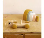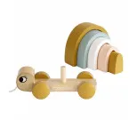 En rolig leksak av trä som kombinerar ett dragdjur och roligt formade stapelklossar i olika färger. Leksakens bas består av en avlång platta med fyra hjul och en sköldpaddas huvud där ett dragsnöre är fäst. Mitt på plattan finns en kort pinne där man sätter den minsta klossen, som är formad som en spetsig oval delad på hälften, och sedan fyller på med trä-bågar i allt större storlek tills sköldpaddan har fått ett färgglatt skal och är redo att tas på promenad. De bågformade blocken kan också arrangeras helt på egen hand eller staplas, även om det kräver lite mer koordination och koncentration av barnet än vanliga kuber gör. Leksaken är tillverkad av björkträ och målad med giftfria färger. Torkas av med fuktig trasa vid behov.