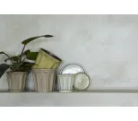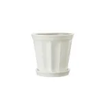 En vacker vit kruka Felina med tillhörande fat, tillverkad av stengods av svenska Wikholm Form. Felina-serien inkluderar olika krukor och färger för att matcha olika behov.