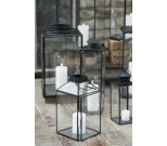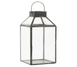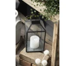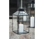 Denna moderna glaslykta med tunna svarta metallkanter och glas i toppen sprider ett varmt ljus och skapar en elegant och inbjudande atmosfär.