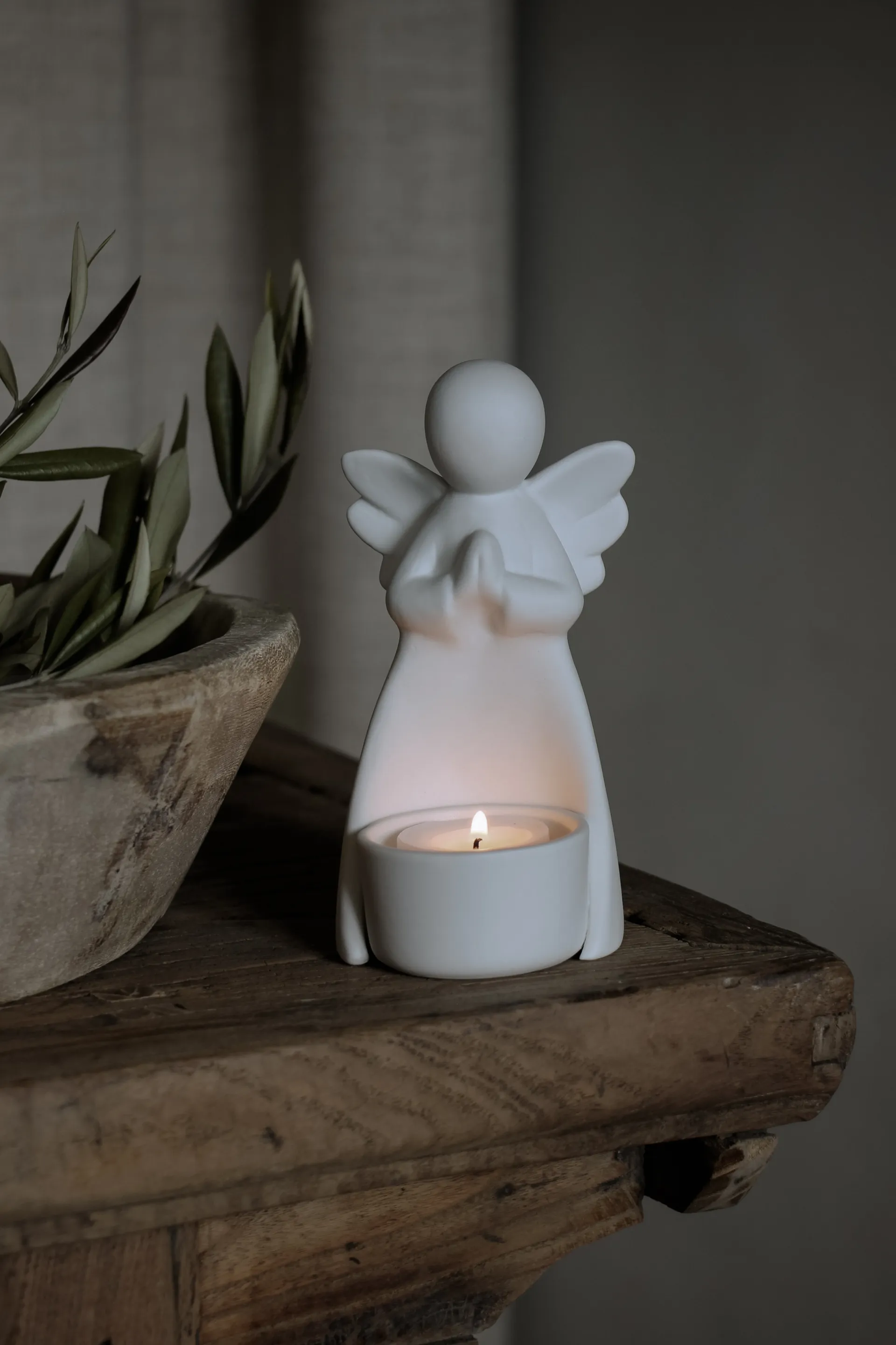 Majas Skyddsängel är en stämningsfull ljushållare i form av en ängel, skapad för att ge en känsla av trygghet, ljus och närvaro. Tillverkad i vit keramik med plats för ett värmeljus, sprider den ett stilla sken som värmer både hjärta och hem.