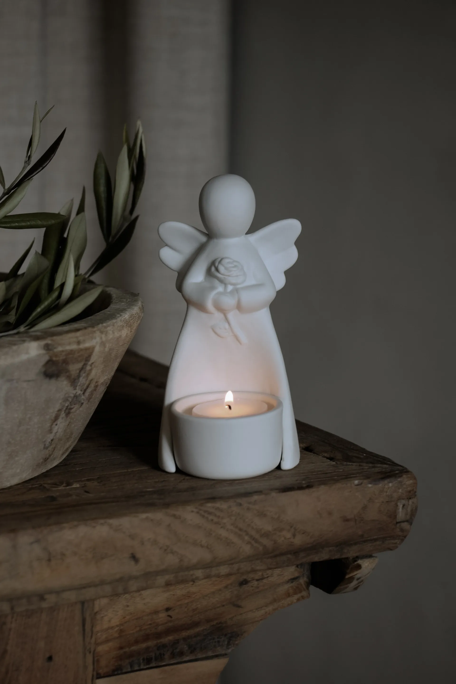 Majas Skyddsängel är en stämningsfull ljushållare i form av en ängel, skapad för att ge en känsla av trygghet, ljus och närvaro. Tillverkad i vit keramik med plats för ett värmeljus, sprider den ett stilla sken som värmer både hjärta och hem