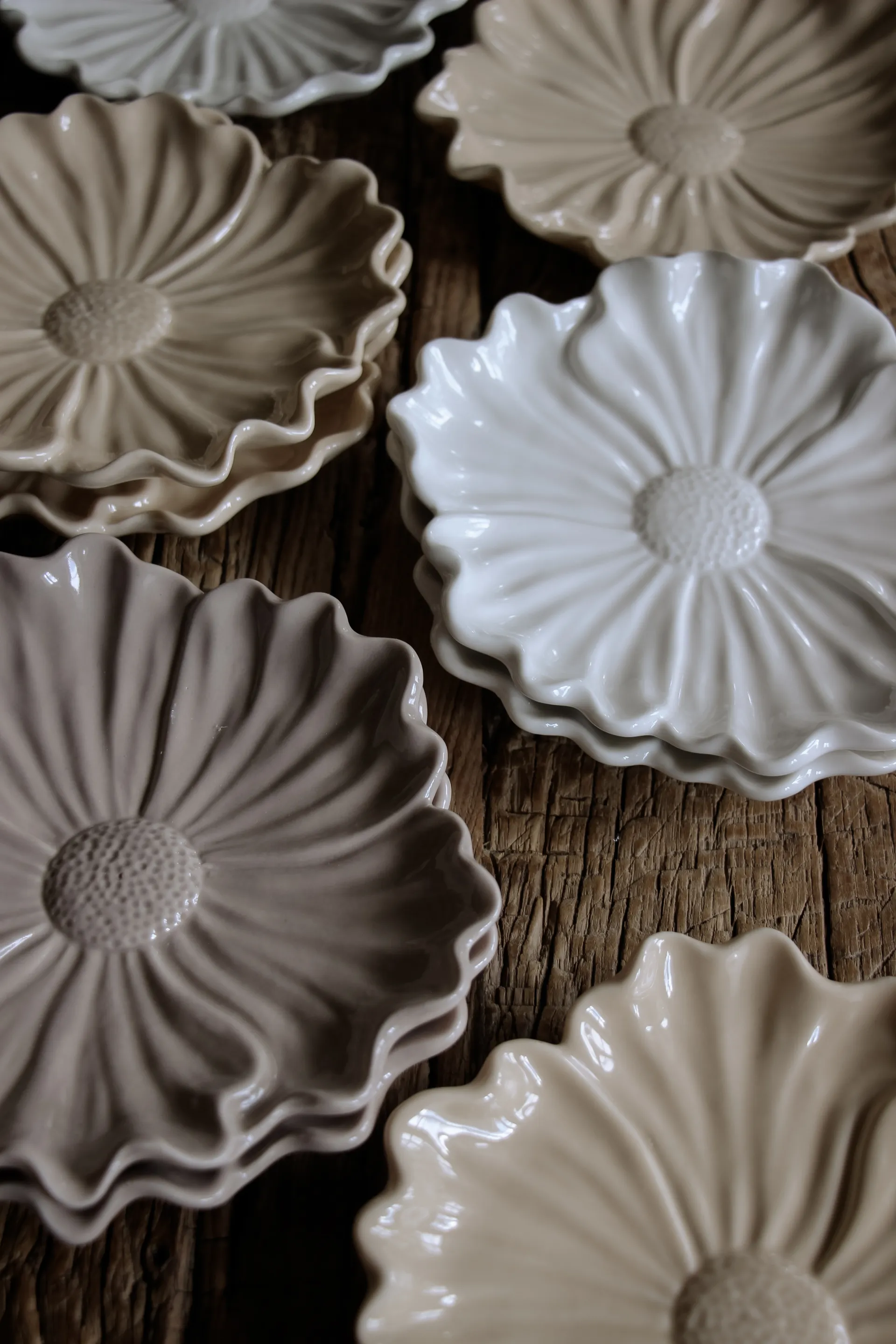 Majas Blomstra fat är elegant utformade i blomformad design med mjukt vågiga kanter och glaserad yta. Passar lika fint för servering som till dekoration – ett vackert inslag i varje hem.