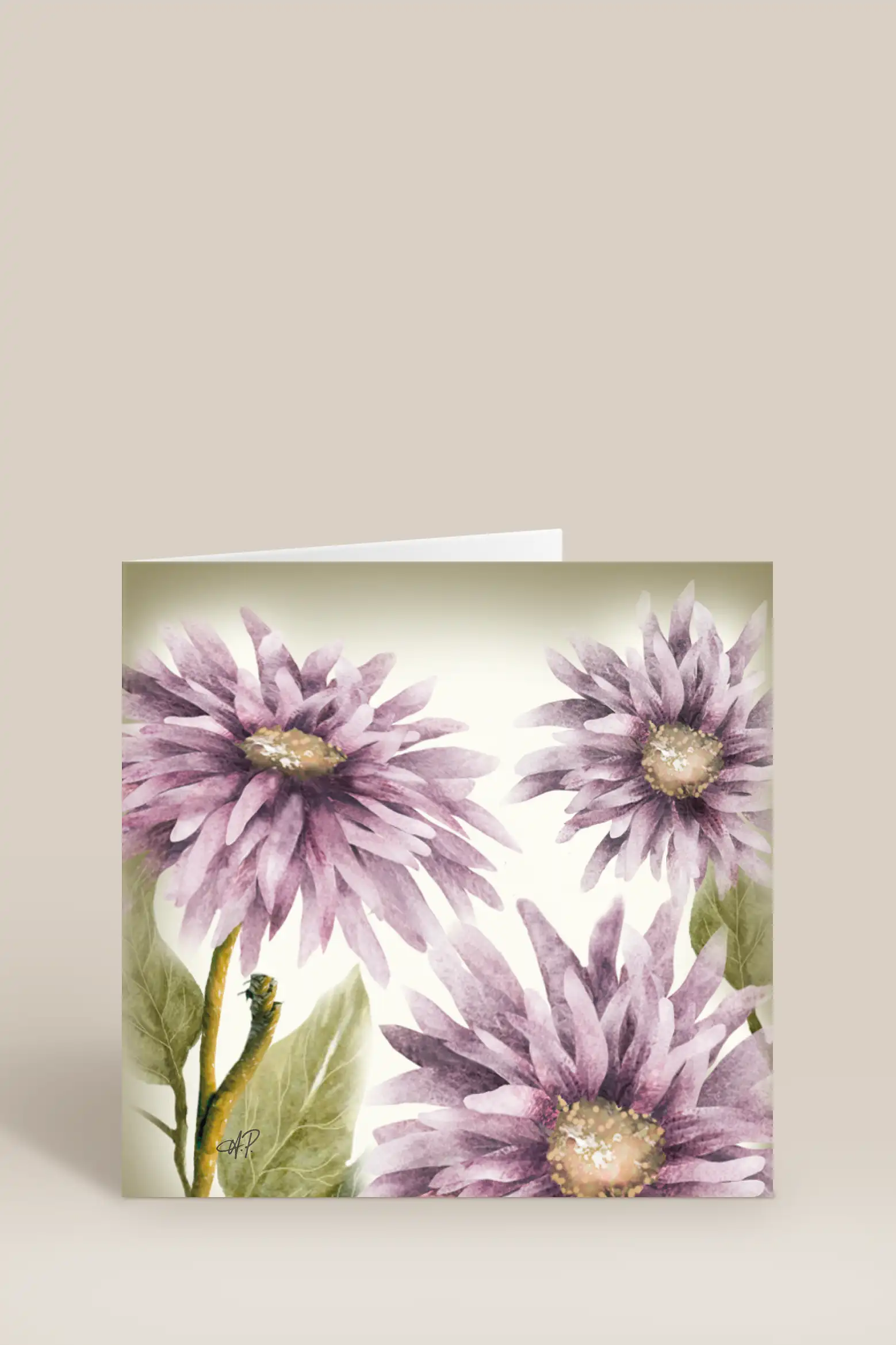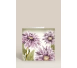 Motivet består av tre handmålade blommor i dämpade lila nyanser med mjuka gröna blad, vilket skapar ett lugnt och harmoniskt uttryck. Kortets design andas tidlös elegans och passar lika bra som gratulationskort, tackkort eller bara för att sprida lite omtanke.