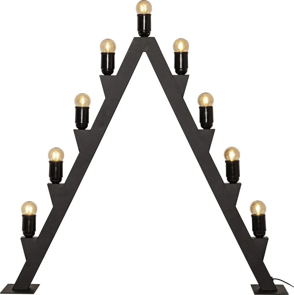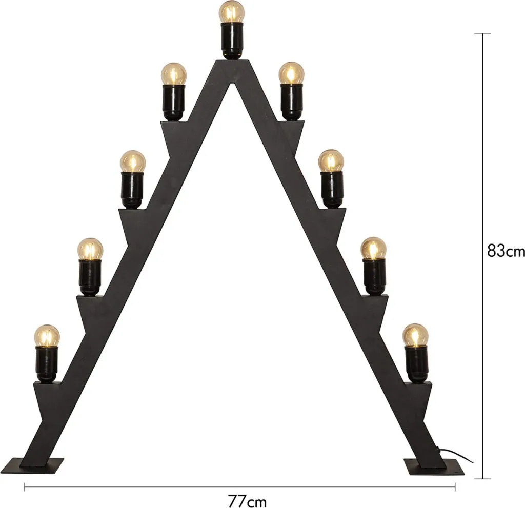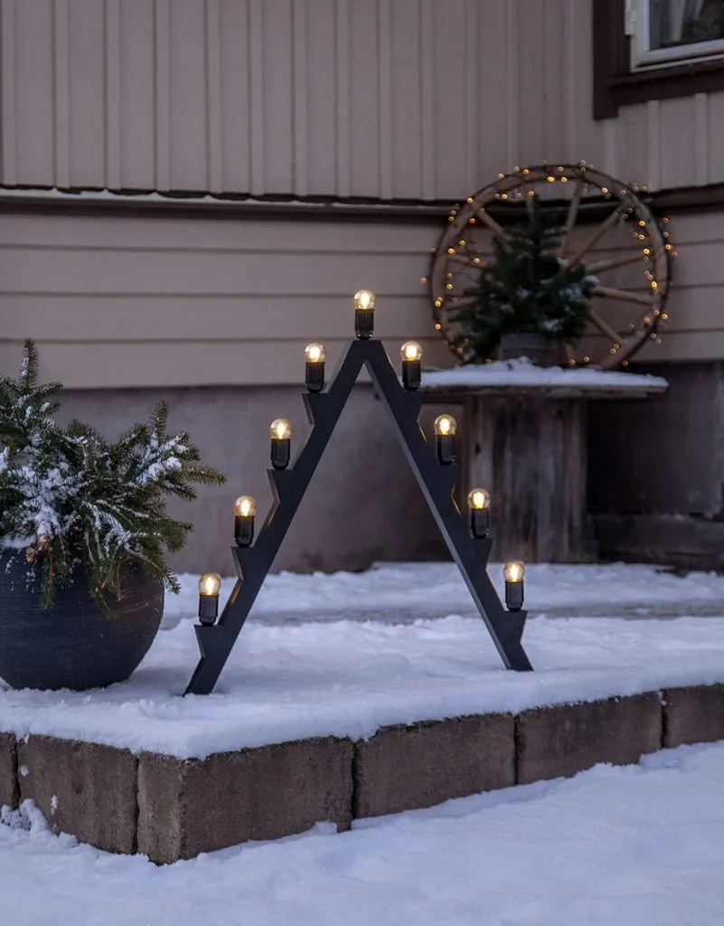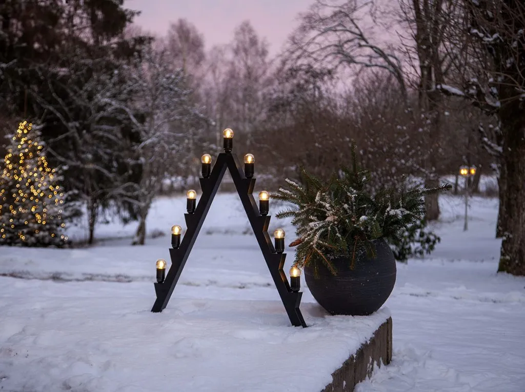 En stor och modern adventljusstake i metall, passar för utomhusbruk.