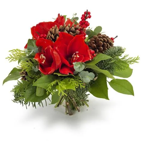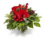 Amaryllisbuketten är en elegant och lågbunden bukett som fångar känslan av jul. Med lysande röd amaryllis, röda ilexbär, kottar och mycket olika grönt skapas en harmonisk blandning av material och textur. Denhär buketten passar lika bra som en uppskattad gåva som på julbordet.