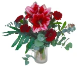 Skapa en stilfull och modern julstämning med Amalias exklusiva amaryllisbukett med tvåfärgad amaryllis. Den vackert mönstrade amaryllisen kombineras med mjuka nejlikor, frisk eucalyptus, dekorativ skimmia och fylligt grönt för att skapa en harmonisk och lyxig bukett.
