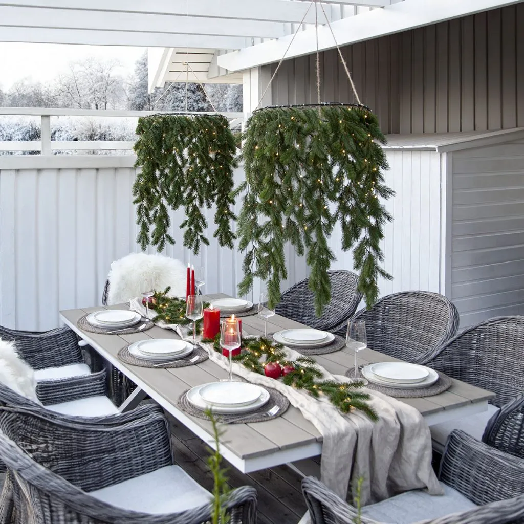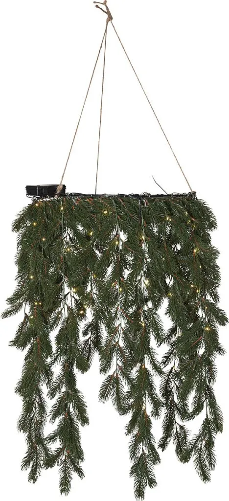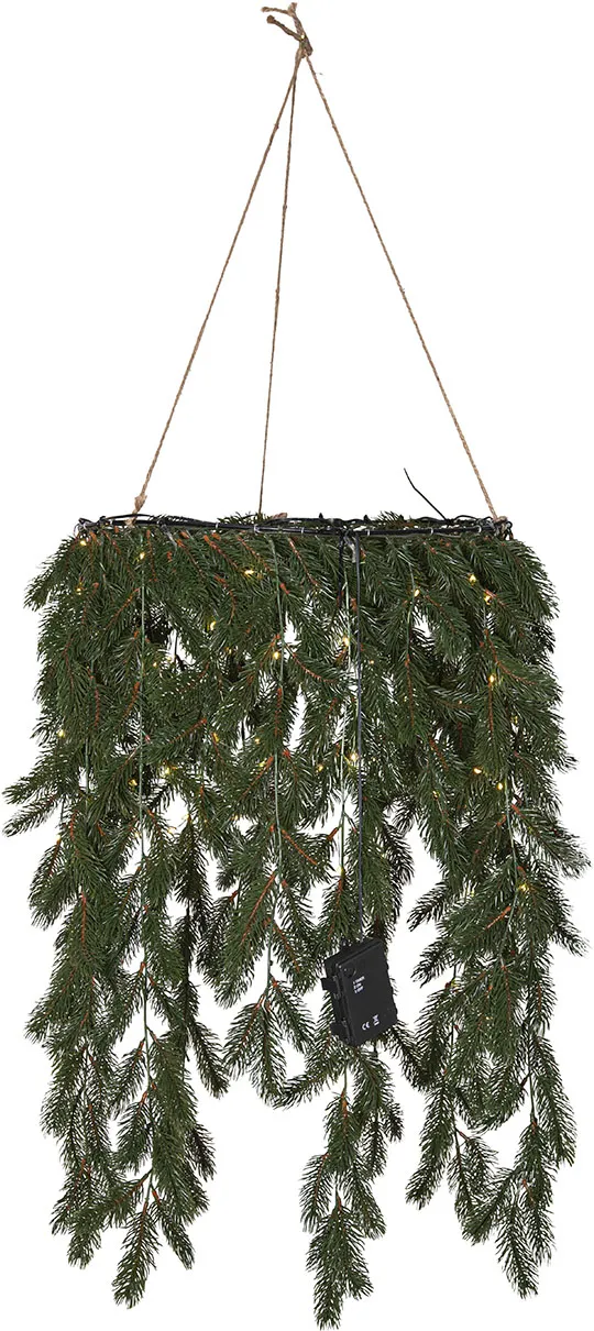 En vacker konstgjord krans med mörkgröna barr gjorda i polyetylen som ser mycket naturtrogna ut. Denna krans hänger horisontellt och lyser upp med 80 varmvita Dew Drop LED.