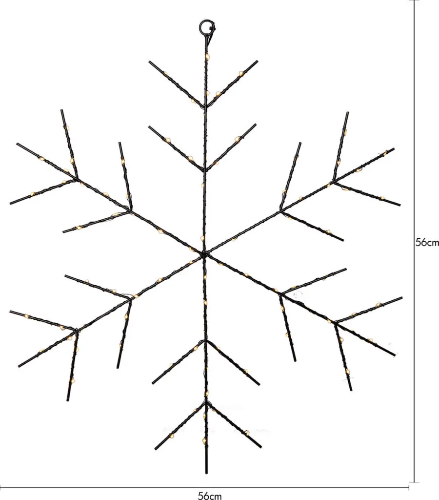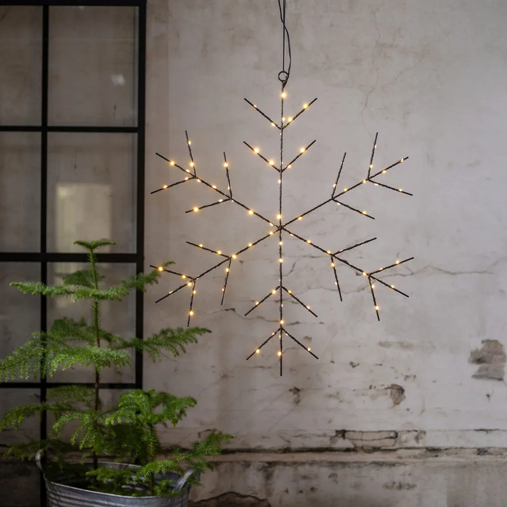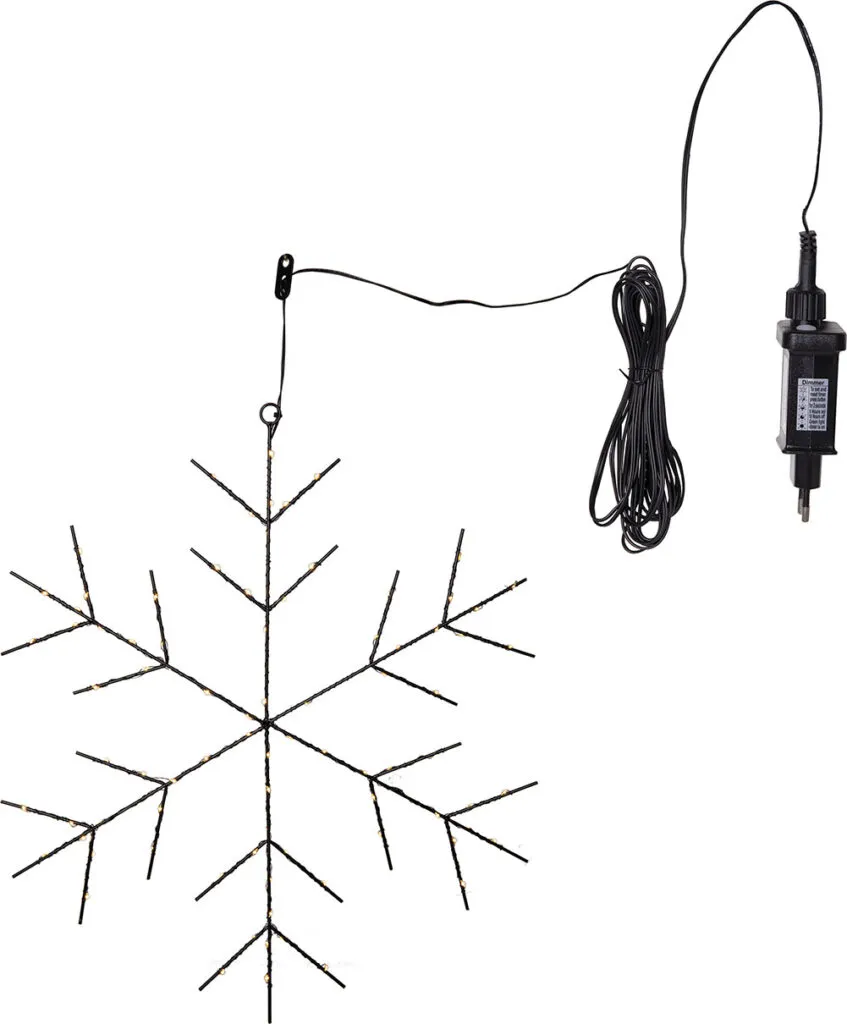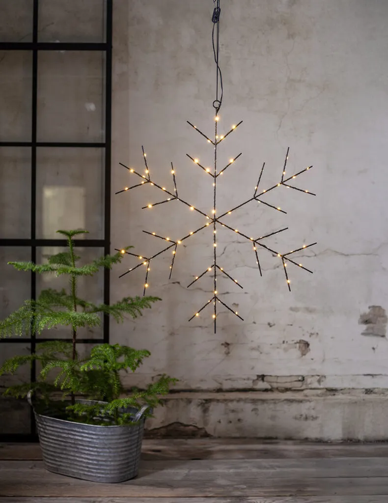 Lysande snöflinga gjord i metall. Siluetten har en fastsatt ljusslinga med 88 små LED-punkter som lyser med varmvitt sken. Produkten har timer och ljusstyrkan går att ställa i tre olika lägen.