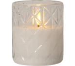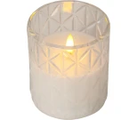 Aidosta vahasta valmistettu LED-kynttilä lasitelineessä timanttikuviolla.