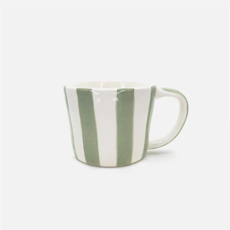 Vihreä raidallinen muki Bruka Designin Capri-sarjasta, 35 cl. Ajaton keramiikkamuki lämpimille juomille.