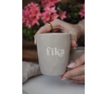 Hillitty valkoinen teksti sulautuu kauniisti vaaleaan lasitteeseen, luoden harmonisen ja ajattoman ilmeen. Kahvaton design antaa modernin ja luonnollisen tuntuman käteen, mikä tekee mukista miellyttävän käyttää niin aamukahvilla kuin iltateellä.