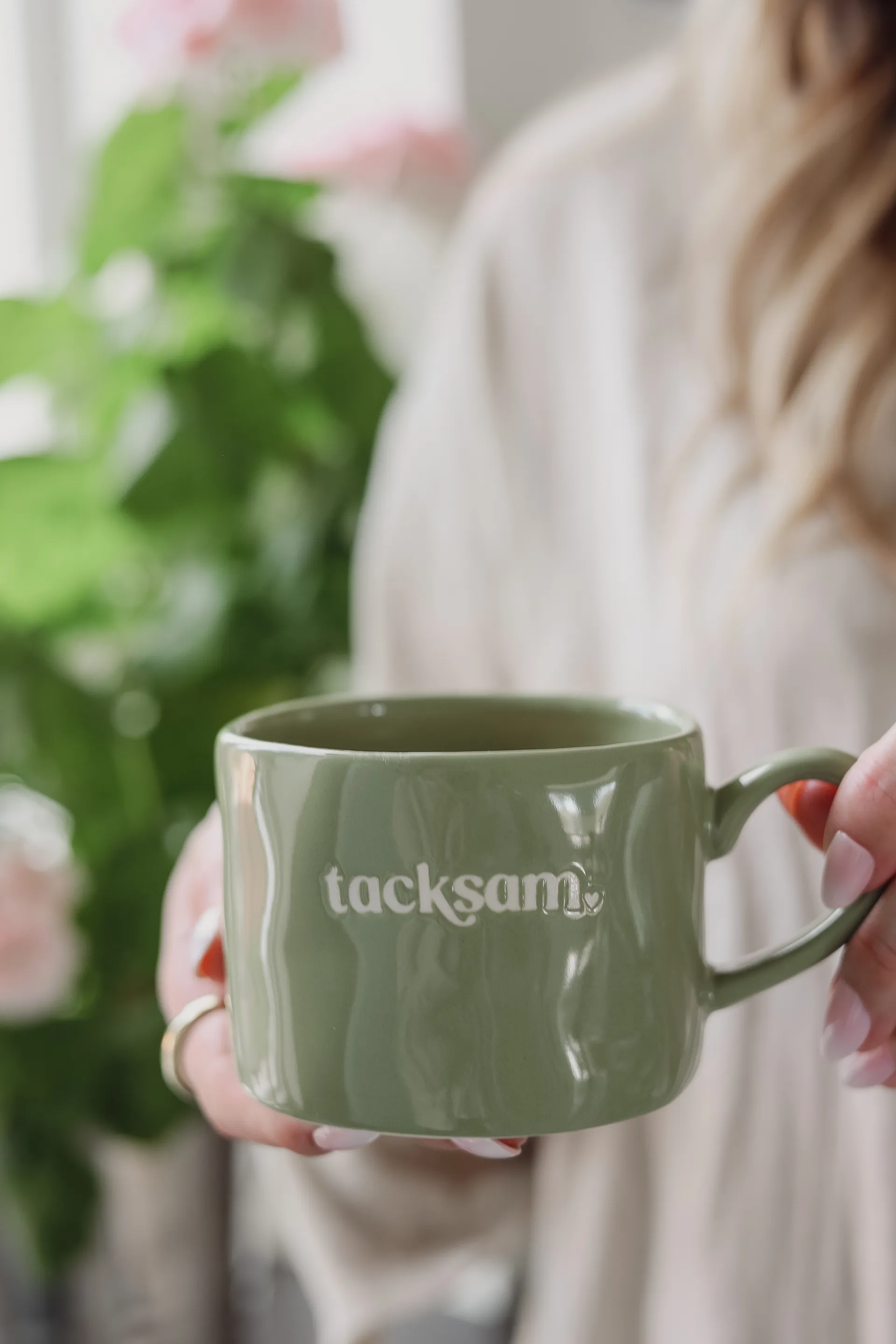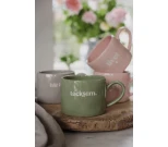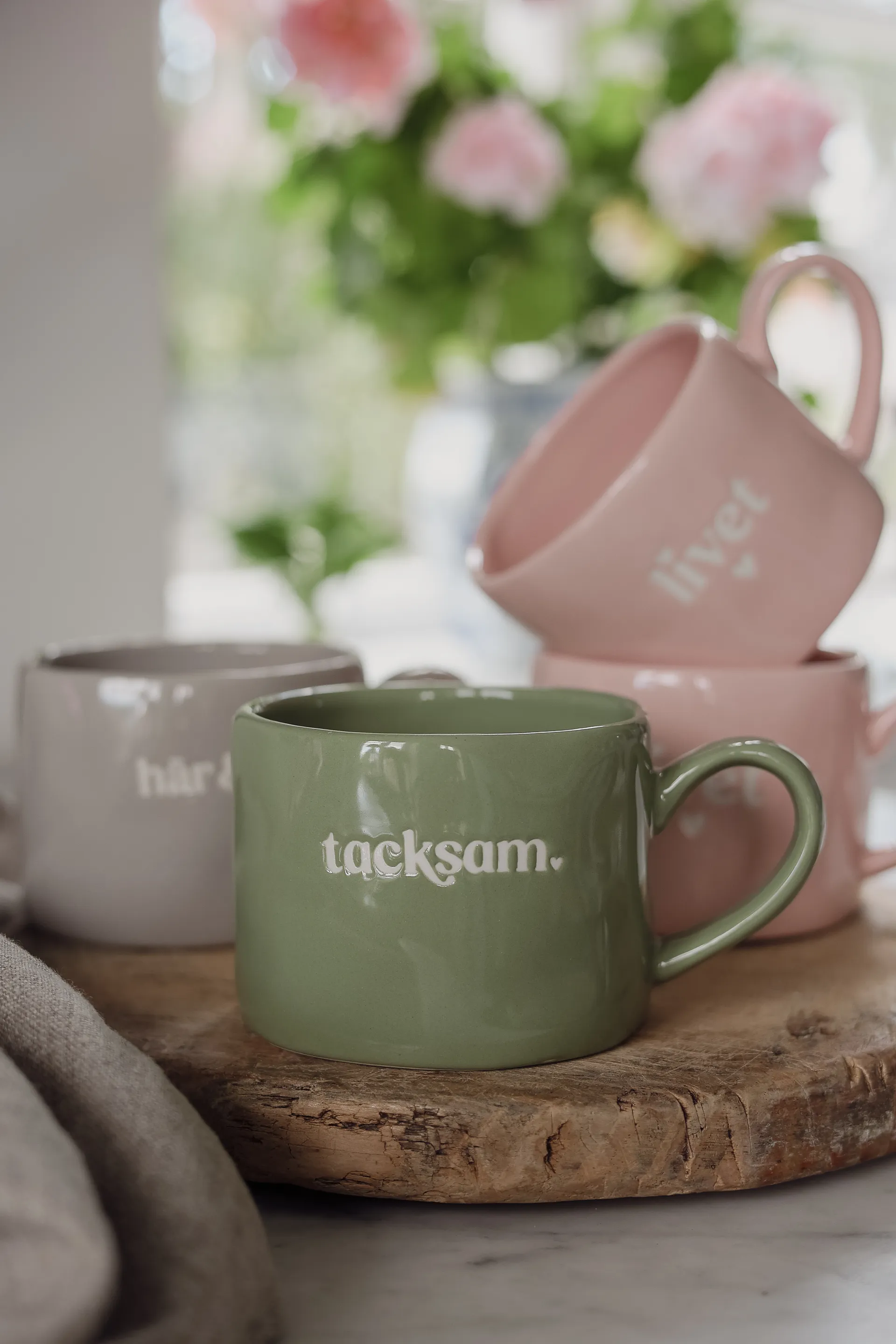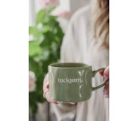 Tämä vihreä muki on täydellinen pieni arjen ilahduttaja. Valkoinen teksti “Tacksam” on ruotsia ja tarkoittaa “kiitollinen” – kaunis ja rauhallinen muistutus pysähtyä huomaamaan kaikki hyvä ympärilläsi.