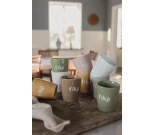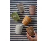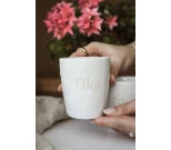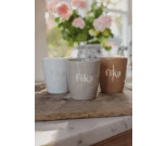 Hillitty valkoinen teksti sulautuu kauniisti vaaleaan lasitteeseen, luoden harmonisen ja ajattoman ilmeen. Kahvaton design antaa modernin ja luonnollisen tuntuman käteen, mikä tekee mukista miellyttävän käyttää niin aamukahvilla kuin iltateellä.