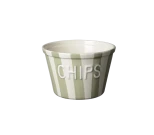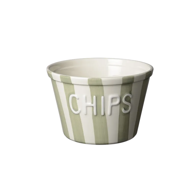 Kestävästä keramiikasta valmistettu kulho on käsinmaalattu salviavihreillä ja valkoisilla raidoilla, ja sen pinnassa on kohoteksti “CHIPS”, joka antaa kulholle leikkisän ja persoonallisen ilmeen. Täydellinen valinta sipsien, popcornin, pähkinöiden tai muiden herkkujen tarjoiluun.