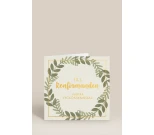 Elegantti rippikortti vihreällä lehtiseppeleellä ja kultaisella tekstillä. Täydellinen onnitteluun rippijuhlassa.