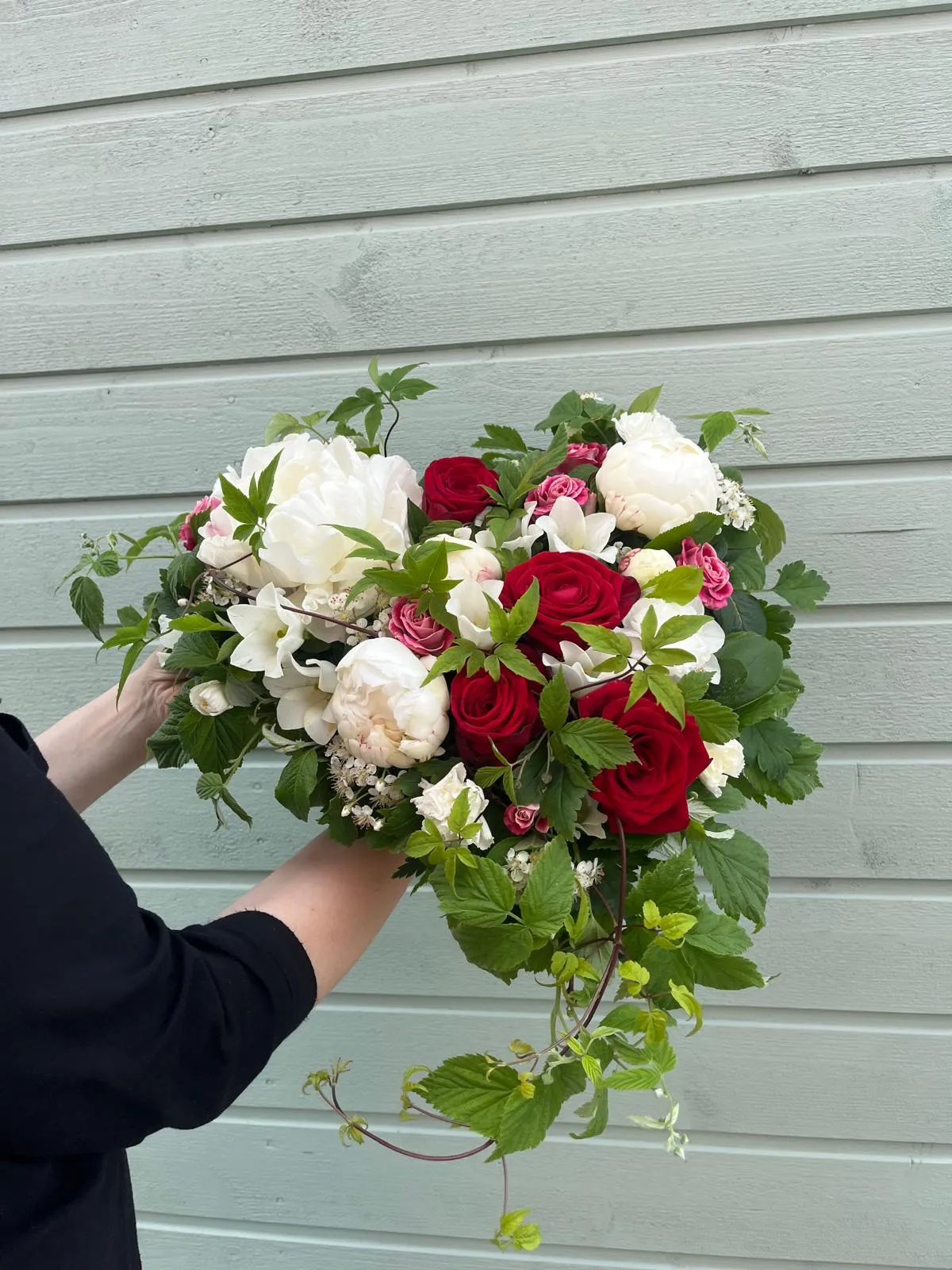 Kaunis ja runsas hautajaissydän, joka on sidottu romanttiseen ja luonnolliseen tyyliin. Kukkakoriste valmistetaan käsityönä floristiemme toimesta ja se sisältää punaisia ruusuja, valkoisia pioneja, vaaleita kauden kukkia sekä raikasta vihreää, jotka yhdessä muodostavat harmonisen ja arvokkaan kokonaisuuden.