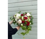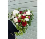 Punaiset ruusut symboloivat syvää rakkautta ja kunnioitusta, kun taas valkoiset kukat tuovat asetelmaan rauhallisen ja herkän ilmeen. Sydämen muoto tekee koristeesta henkilökohtaisen ja lämpimän kunnianosoituksen viimeiseen jäähyväiseen.