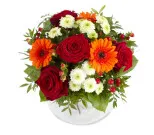 Rundbunden färgglad bukett med röda rosor, orange germini, vit krysantem, hypericum och grönt. Pigg och glad bukett som passar perfekt till alla tillfällen.