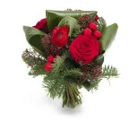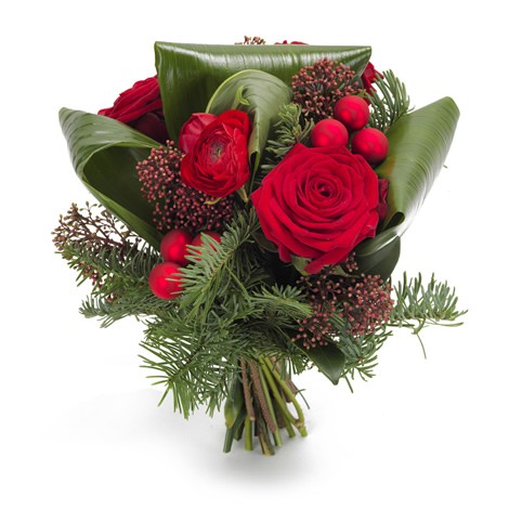 Buketten innehåller klassiska röda rosor som symboliserar kärlek och värme, skimmia med sina små bärliknande knoppar som ger textur, doftande gran för en naturlig julkänsla, samt en mix av grönt för en extra fyllighet och konstrast. Placera denna bukett