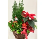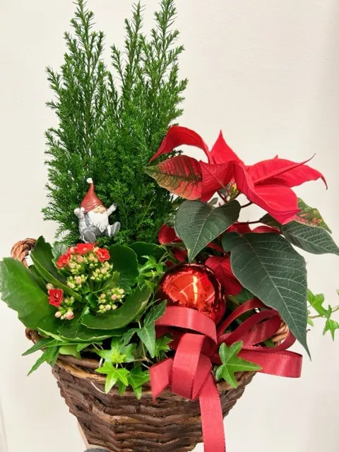 Stilig julplantering i korg med julstjärna julglöd, murgröna, grönmossa och festligt pynt