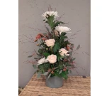 Kestävä asetelma joka koostuu huolella valituista krysanteemeista eri sävyissä, samppanjanvärisistä ruusuista sekä eukalyptuksesta ja heinäoksista