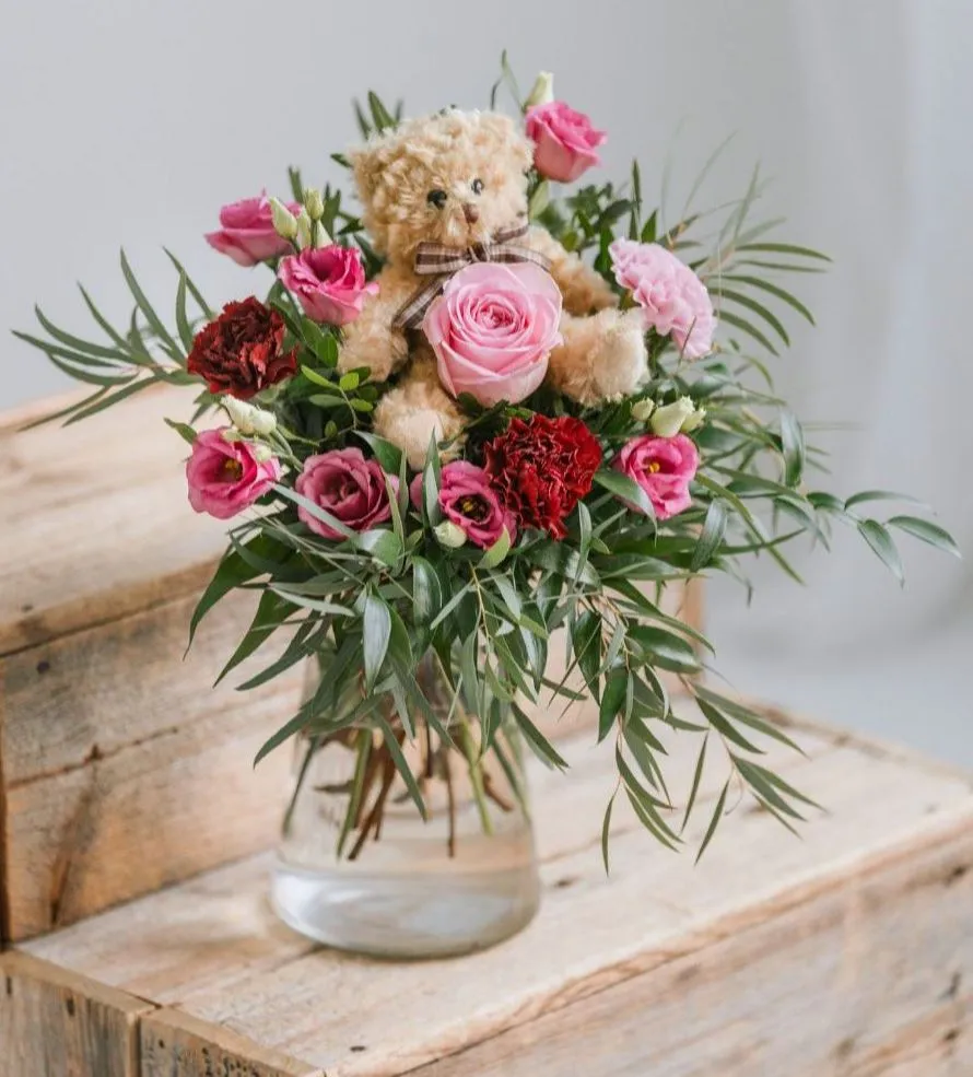 Kimppu sidotaan käsin floristeillamme käyttäen sesongin kukkia, ja se täydentyy söpöllä nallelahjalla, joka tekee lahjasta erityisen. Se sopii erinomaisesti moniin tilaisuuksiin – esimerkiksi syntymäpäiväksi, vauvaonnitteluihin, rakkauden lahjaksi tai yllätykseksi jollekin, josta välität.