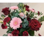 Kaunis kukkakimppu syvänpunaisissa ja vaaleanpunaisissa sävyissä. Toimitamme suoraan kotiovelle tai työpaikalle.