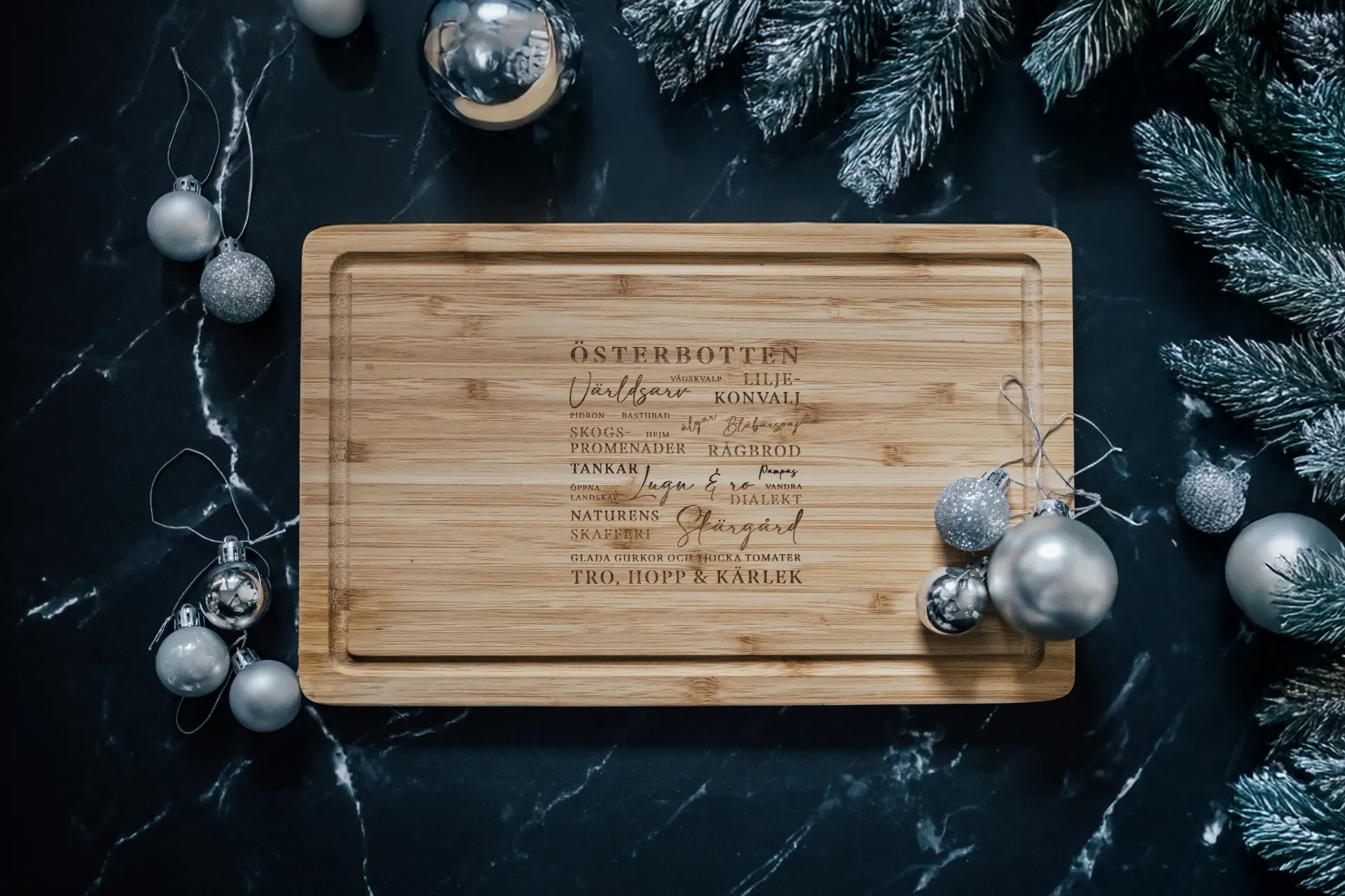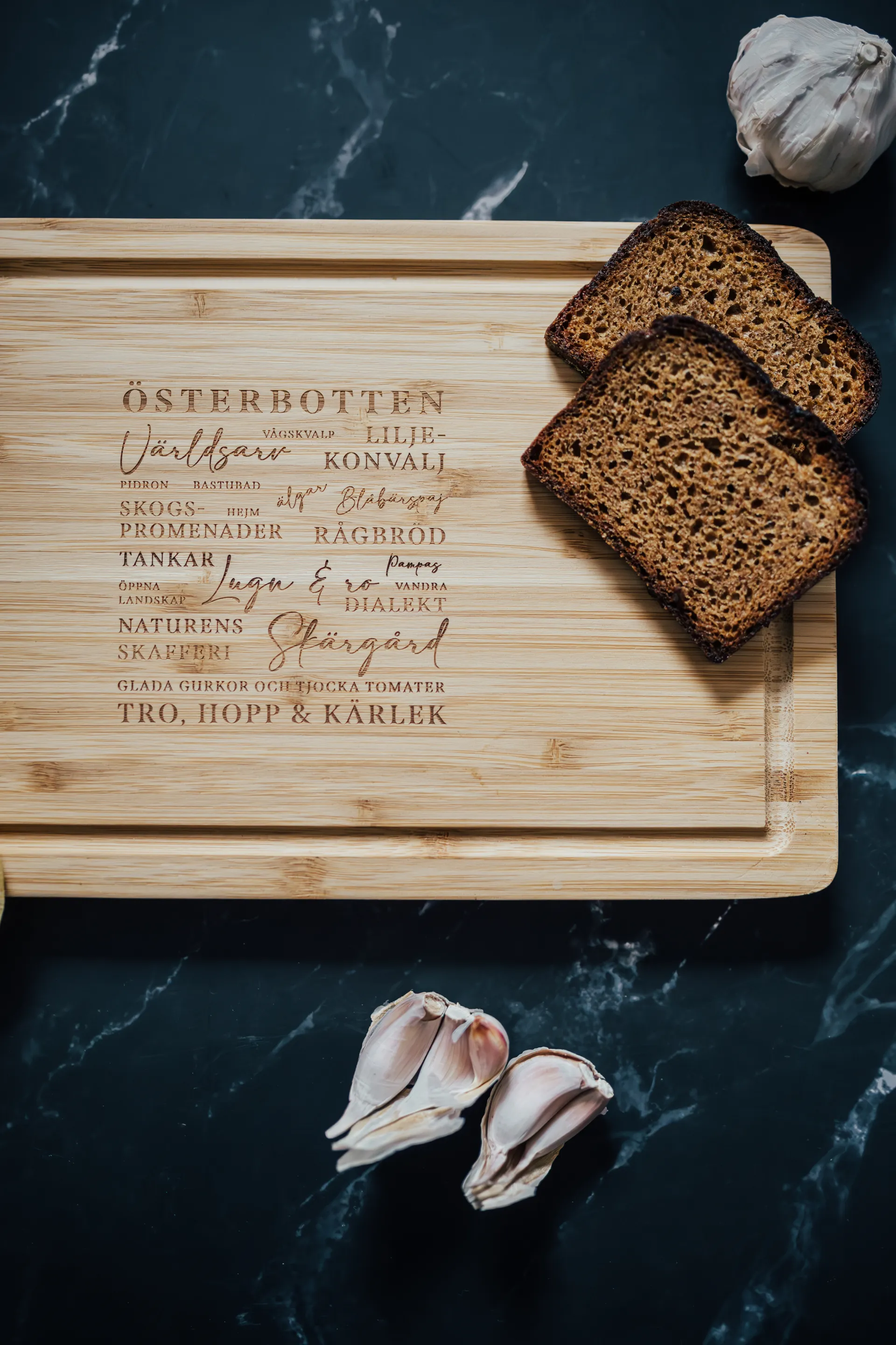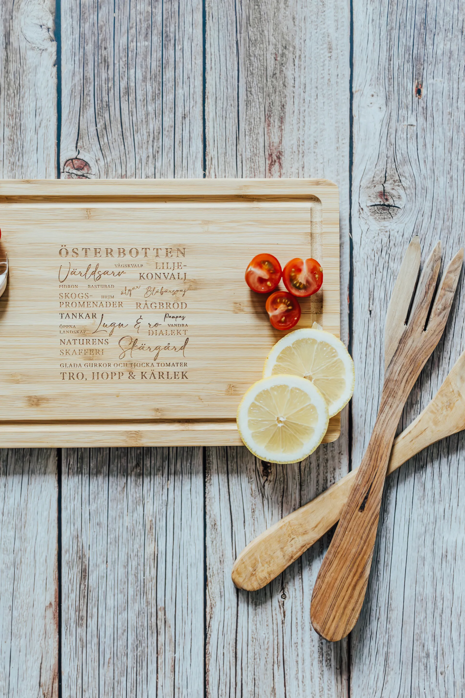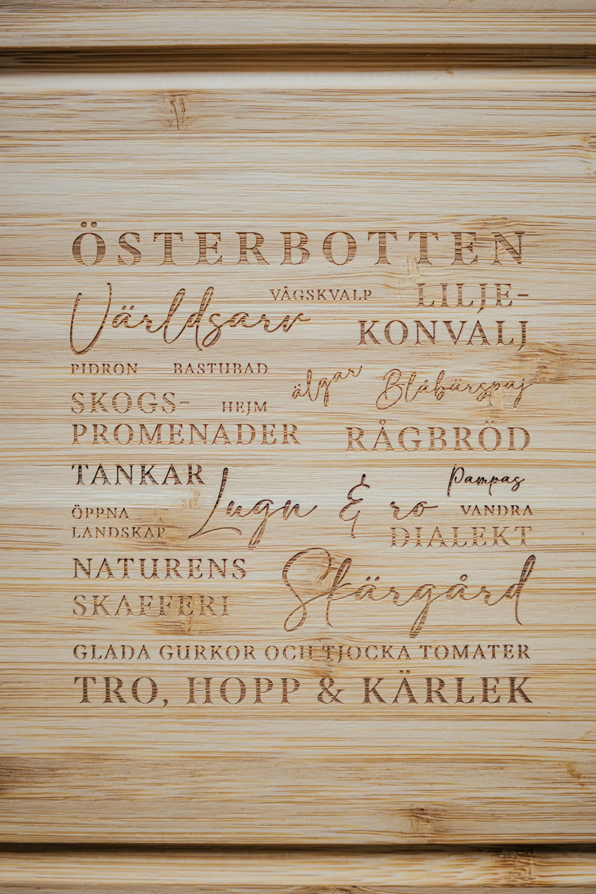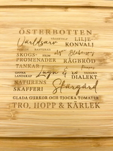 Tyylikäs ja ajaton bambuinen leikkuulauta, jossa on laserkaiverrettuna tuttuja sanoja ja käsitteitä, jotka vievät ajatukset suoraan Pohjanmaan maisemiin ja kulttuuriin