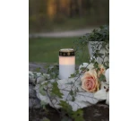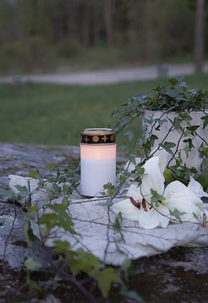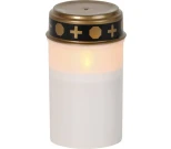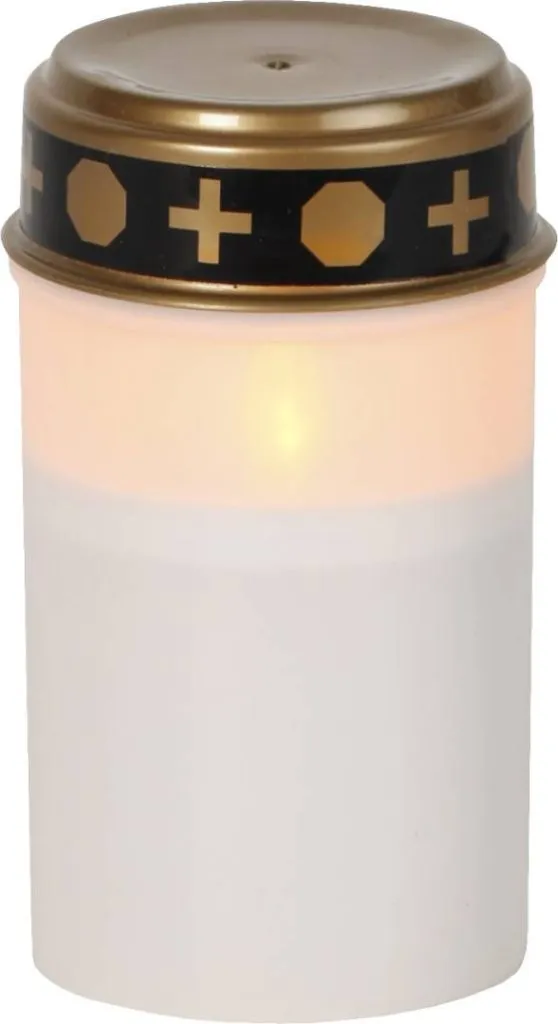 Paristoilla toimiva perinteinen hautakynttilä, jossa loistaa lämpimän valkoinen LED-liekki.