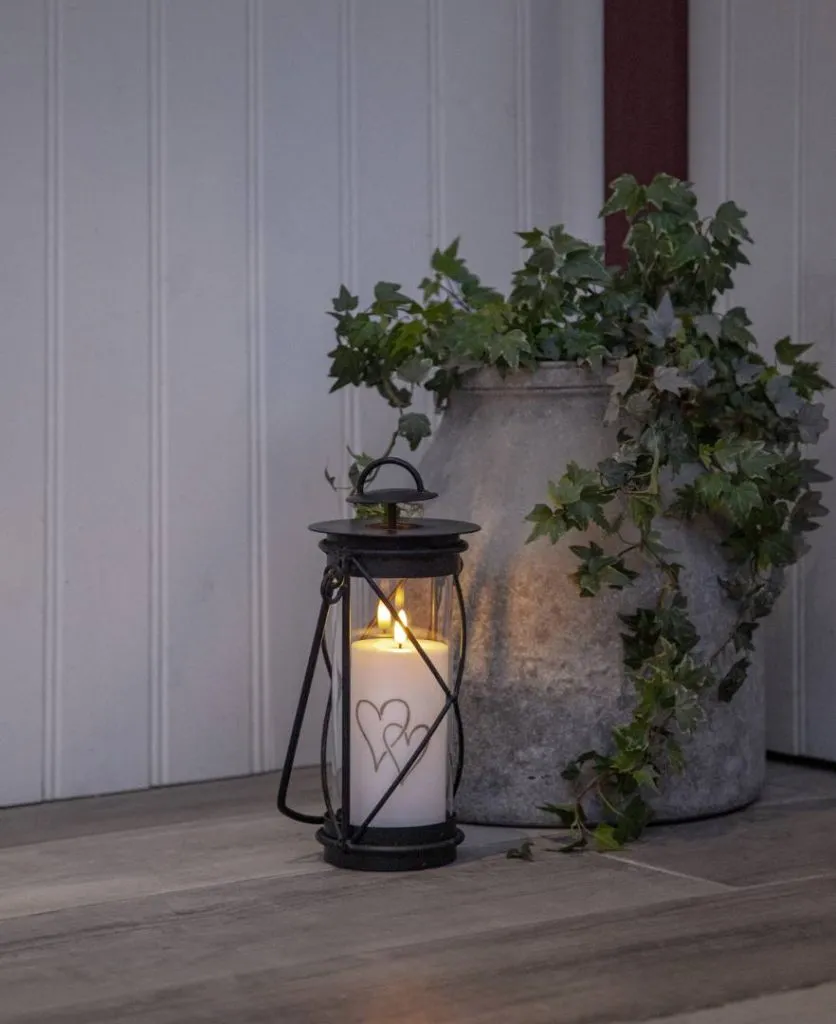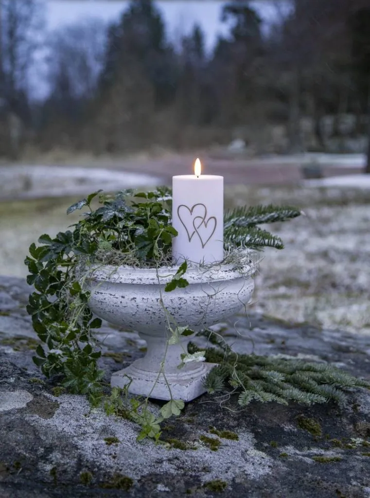 Kynttilässä valaisee aidon näköinen Flamme-liekki lämpimän valkoisella valolla.