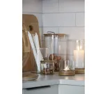 Wikholm Formin pieni Kuta-lasipurkki ruskealla kannella ja nahkalenkillä on täydellinen säilytyspurkki keittiöön. Laita kuivaruokasi kuntoon tai täytä purkki jollain hyvällä ja anna lahjaksi.