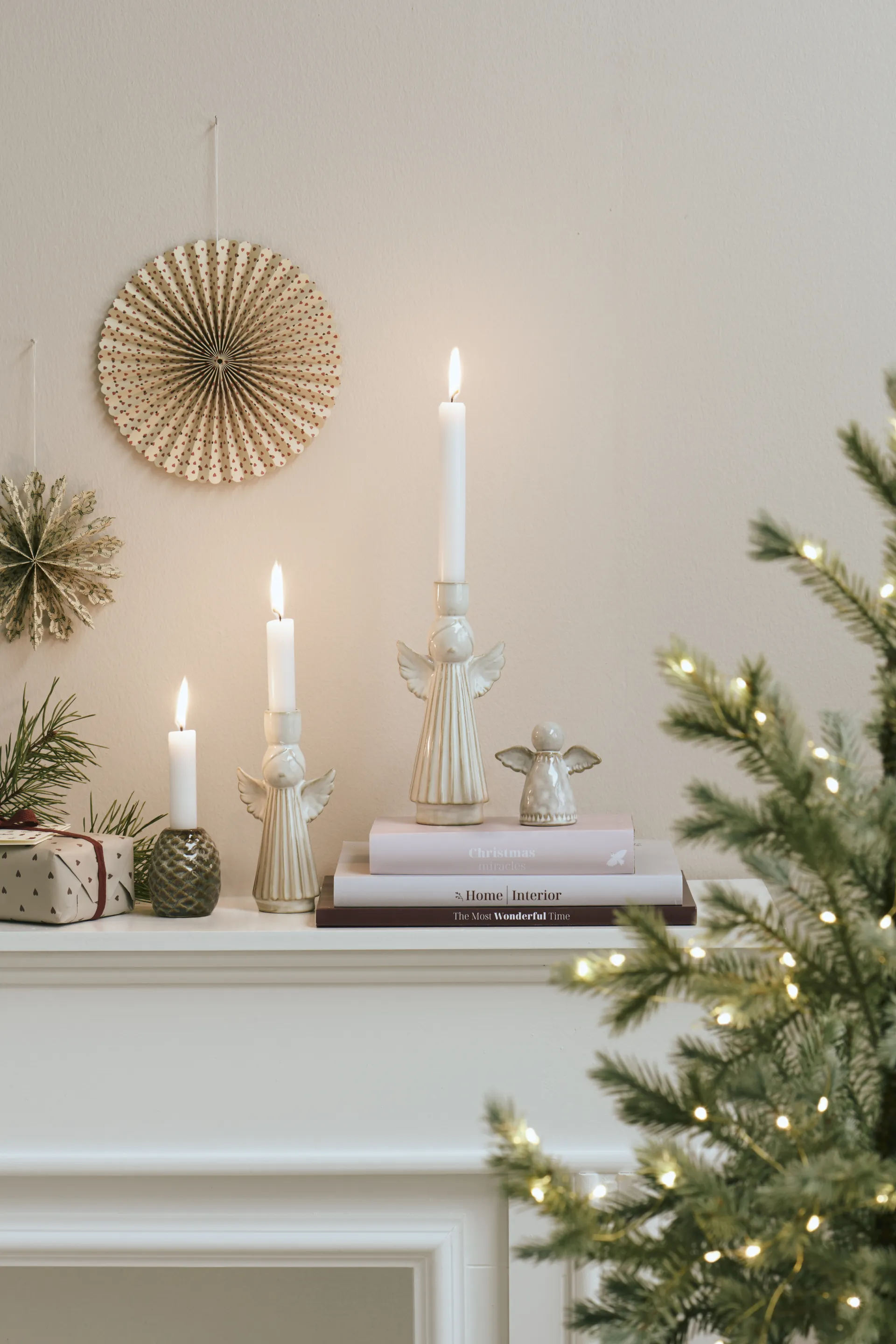 Denna vackra ljusstake formad som en ängel sprider både ro och stämning i hemmet. Den mjuka glasyren och de fina detaljerna gör den till en tidlös dekoration som passar lika bra i advent som året runt.