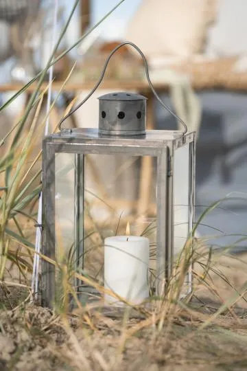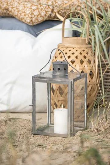 IB Laursenin neliömäinen metallilyhty harmaassa pellavansävyssä luo lämpimän ja kutsuvan tunnelman. Täydellinen koristeeksi pöydälle, hyllylle tai terassille.