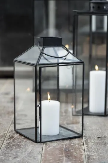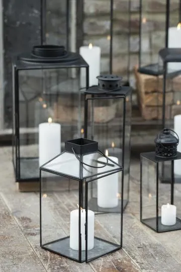 IB Laursenin moderni lasilyhty ohuilla mustilla metallireunoilla ja lasikannella levittää lämmintä valoa ja luo elegantin tunnelman.