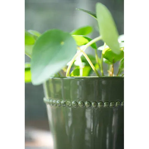 Elegantti valkoinen dolomiittiruukku aluslautasella ja kauniilla helmireunuksella. Ruukussa on reikä pohjassa, mikä tekee siitä täydellisen kasveille.