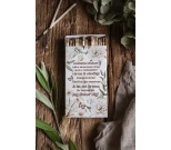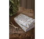 Tulitikkuaski tekstillä. Kauniisti keväinen kuvitus, pitkät tulitikut ja ruskeat tulitikunpäät. Ihana yksityiskohta kotiin tai täydellinen lisä lahjaan.