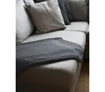 Neulottu harmaa puuvillapeite Vigge Storefactorylta. Viltti on korkealaatuinen ja mukavan tuntuinen. Siihen on täydellistä kietoutua syksyn pimeyden tullessa.